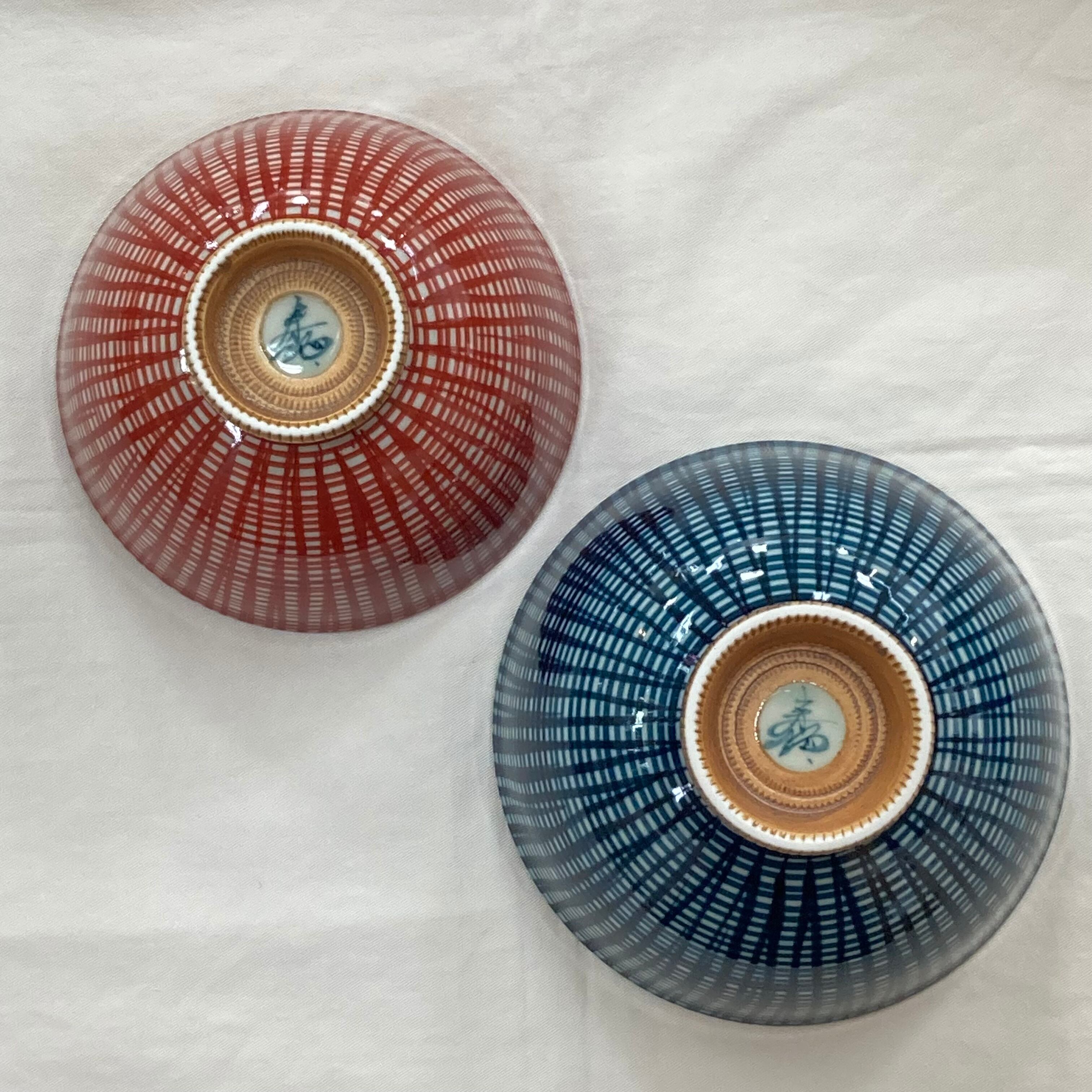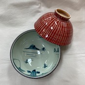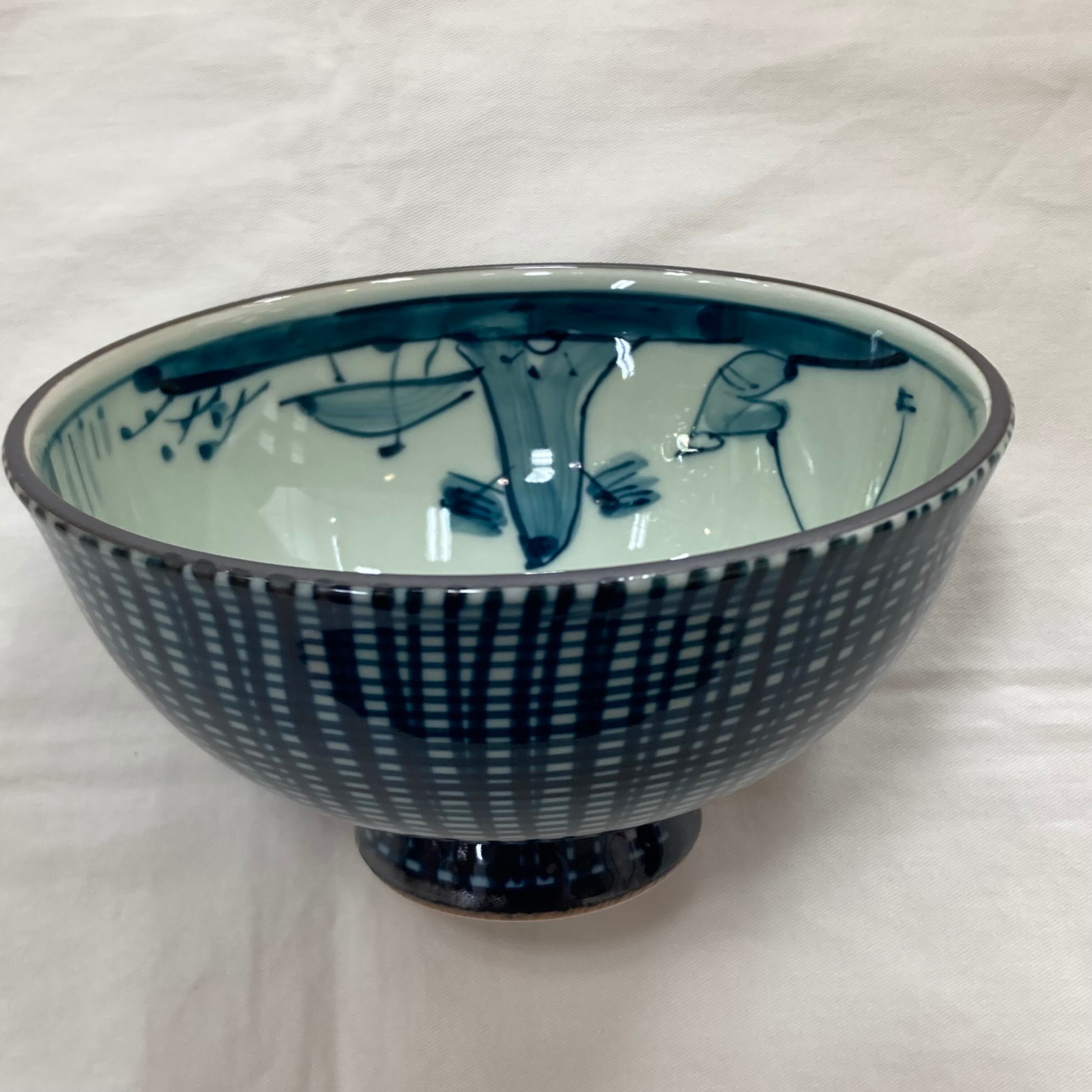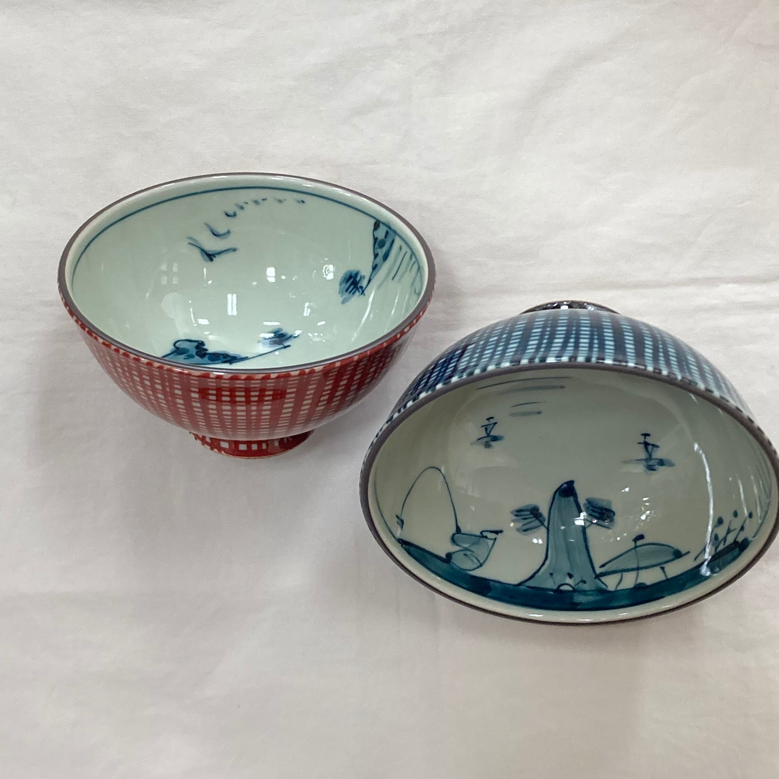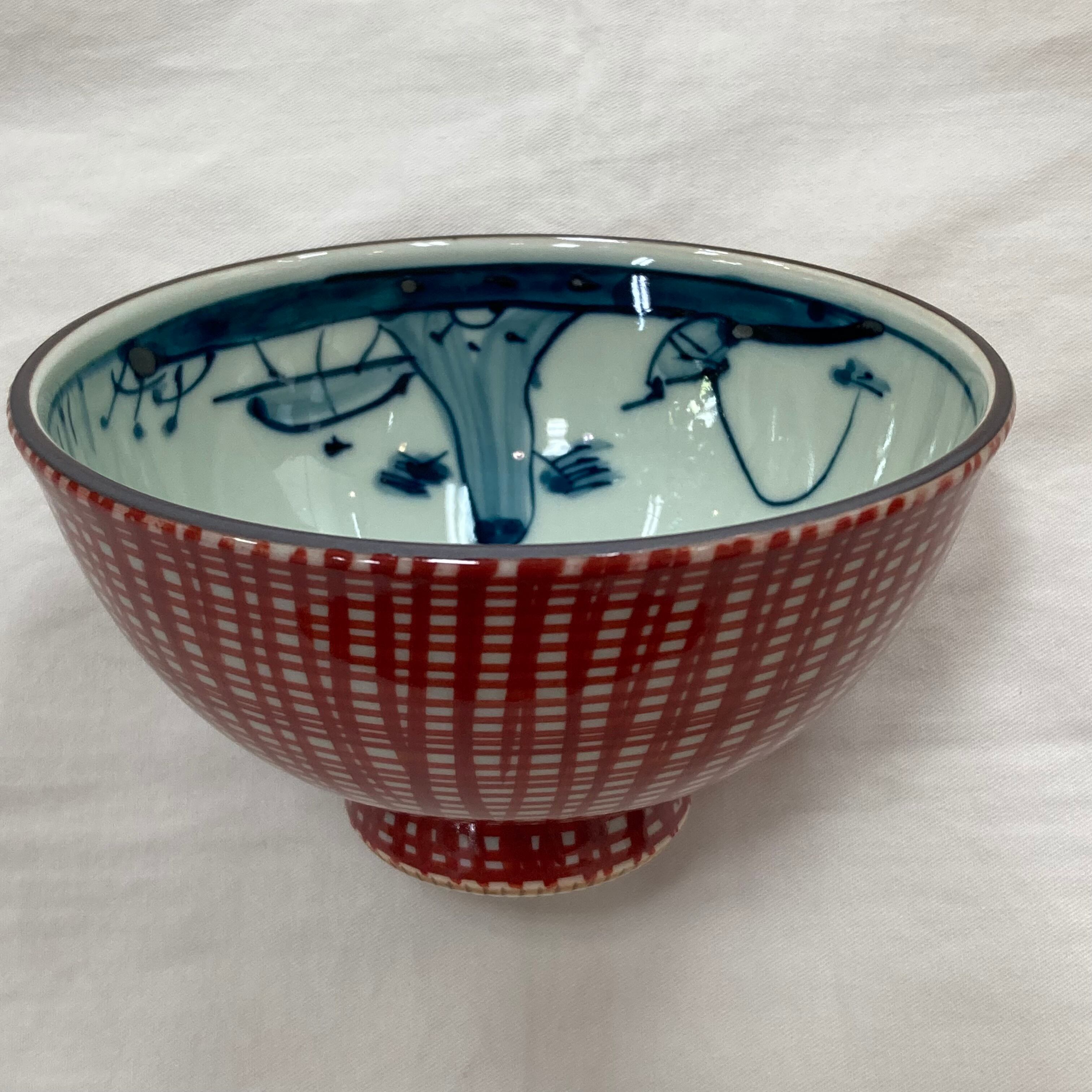 驚くほど軽い飯碗です。内側の山水も外側の格子柄も全て手描きです。丸みを帯びた形は手に馴染み、飽きのこない柄とともに、お気に入りの一品になると思います。ご年配の方にもお勧めです。